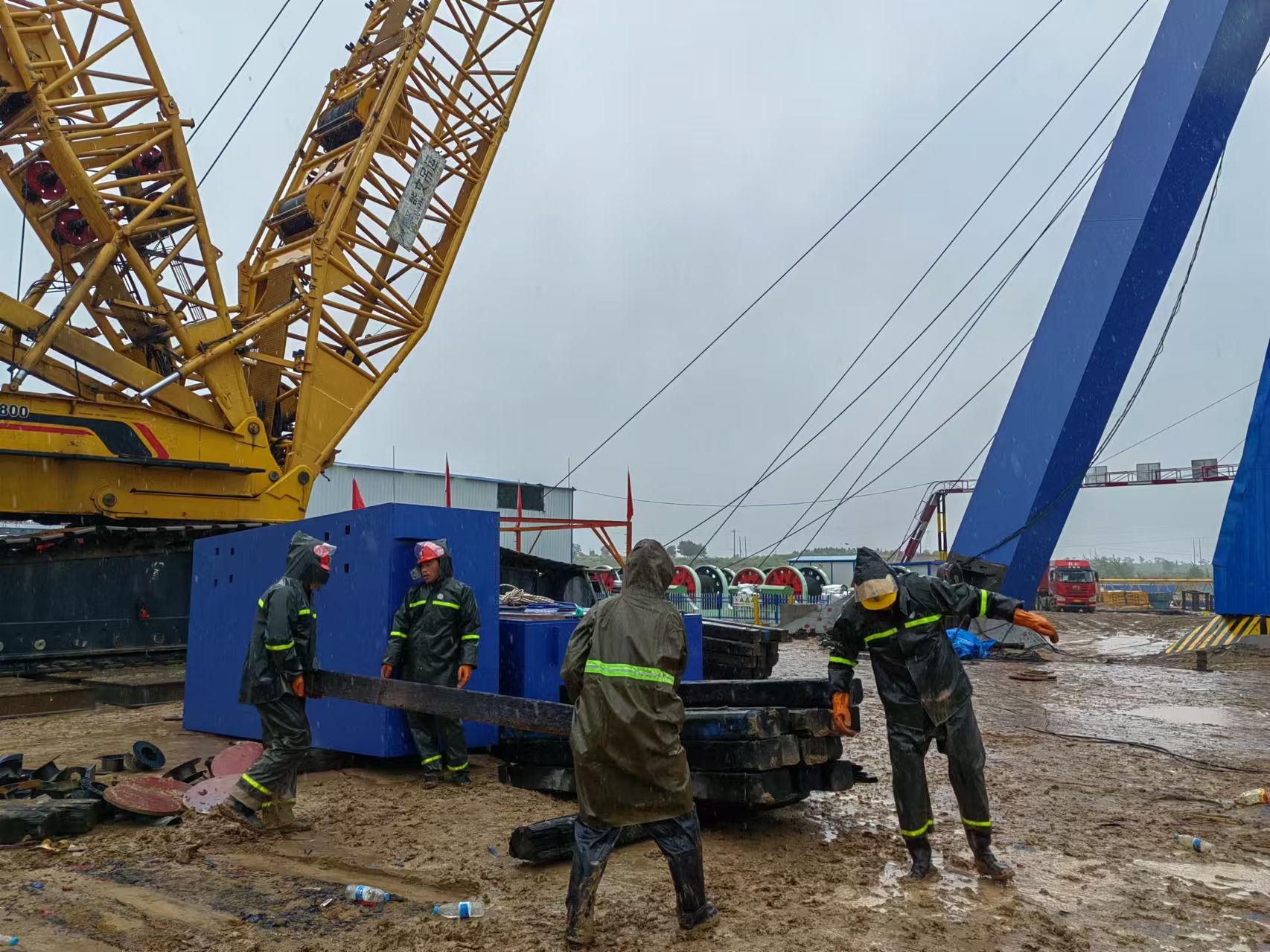 在雨幕的笼罩下,施工现场变得泥泞不堪,每一步都显得异常艰难。即使在这样的恶劣天气下,仍然有一群第十三项目部的工人选择坚守岗位、手持工具在雨中战斗。他们没有丝毫退缩,即使面对风雨,他们也要勇往直前,用实际行动诠释着“风雨无阻”的精神。雨水打湿了他们的衣衫,却浇不灭他们心中的热情与执着,他们身穿雨衣,脚踏泥泞,用手中的焊枪对箱体进行焊接,只为抢抓进度,确保工程能够按时完成。为了保证工程安全进行,项目部详细分类制定防雨措施,为确保雨季施工安全,项目部还安排专职人员对每日天气进行观测以及预警,安排专职人员对临建设施、临时用电、工程机械等重点施工区域、重点部位进行不间断安全检查,确保雨季施工安全、进度“两不误”。